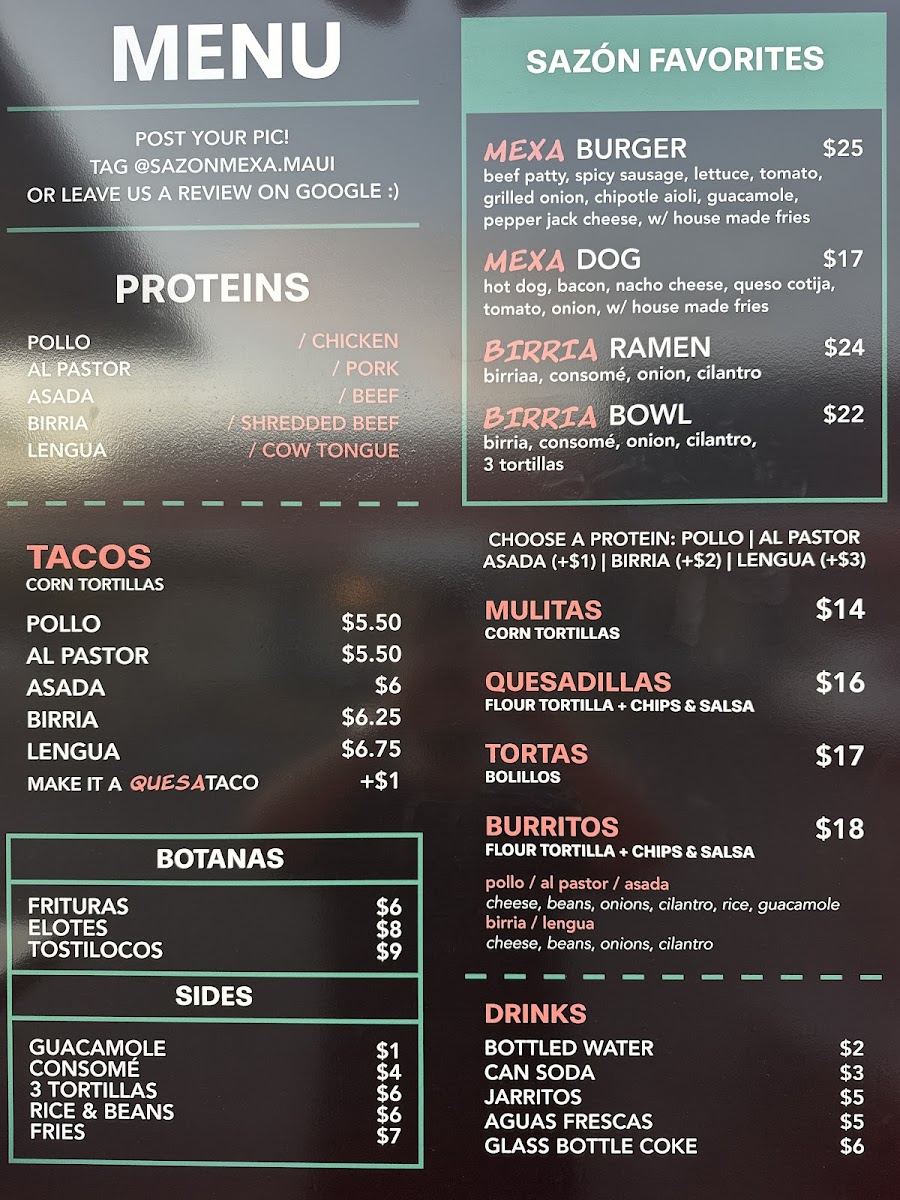 Introducing Sazon Mexa, a hidden gem in Lahaina, Hawaii, where the essence of authentic Mexican cuisine comes alive. Located at 3636 Lower Honoapiilani Rd, this charming food truck serves up mouthwatering dishes crafted with fresh ingredients, making each bite a delightful experience. The menu features a vibrant selection of botanas like Frituras and Tostilocos, as well as a variety of hearty tacos, including the tantalizing Birria and flavorful Asada. Customers rave about the inventive sauces and the generosity of portions, ensuring that every diner leaves satisfied. With remarkable reviews praising the friendly staff and quick service, Sazon Mexa has quickly become a must-visit foodie spot for both locals and tourists. Whether you’re munching on a crispy quesadilla or savoring a hearty burrito, the flavorful offerings paired with the ocean breeze make for an unforgettable dining experience. Don’t miss out on this culinary treasure!